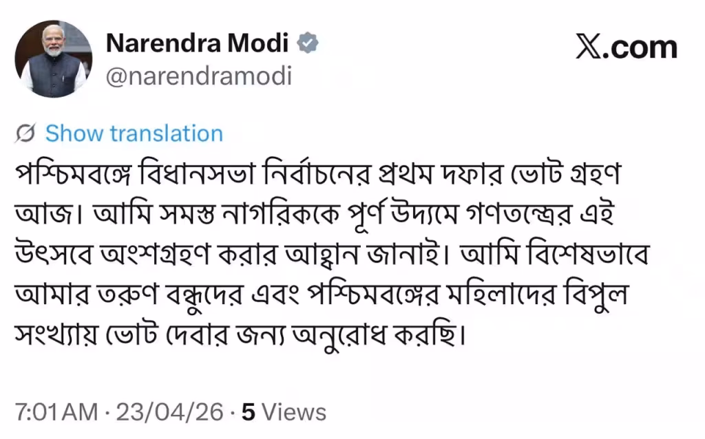 আজ পশ্চিমবঙ্গে প্রথম দফার বিধানসভা ভোট। রাজ‍্যের ১৬ জেলার ১৫২ আসনে ভোট। ভোরবেলা থেকেই ভোটের লাইন জড়ো হয়েছেন রাজ‍্যবাসী। এই উপলক্ষে প্রধানমন্ত্রী নরেন্দ্র মোদি রাজ্যের নাগরিকদের উদ্দেশে গুরুত্বপূর্ণ বার্তা দিয়েছেন। তিনি বলেন, “আজ পশ্চিমবঙ্গ বিধানসভা নির্বাচনের প্রথম পর্যায়ের ভোট হচ্ছে। আমি সকল নাগরিককে এই গণতন্ত্রের উৎসবে পূর্ণ উদ্যমে অংশগ্রহণ করার আহ্বান জানাই।”