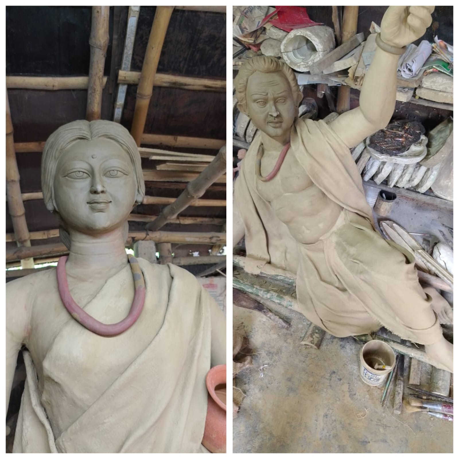 এবার আসা যাক প্রতিমায়। মাতৃপ্রতিমা এবার রূপদান করা হয়েছে এক গ্রাম্যবধূর বেশে। ইংরেজ জামানায় এই গ্রামের সাধাসিধে লোকগুলোর ওপর কর আদায় নিয়ে কম নির্যাতন করেননি সেই সময়ের শোষক জমিদারেরা। সেই নিপীড়ন আর অত্যাচারের হাত থেকে বাঁচতে হন্যে হয় পথ খুঁজেছেন তাঁরা। অবশেষে গ্রাম্য বধূরাই হাতে তুলে নেন প্রতিবাদের অস্ত্র। এখানেই শুরু নারীর ক্ষমতায়নের। যার ফসল আমরা পাচ্ছি বর্তমানে। ভারতের রাষ্ট্রপতি থেকে রাজ্যের মুখ্যমন্ত্রীর পদ অধিকার করেছেন নারীরাই। আর সেই ঘটনাই প্রতিফলিত হয়েছে প্রতিমায়। সেখানে মা দুর্গা এবং শিবকে দেখা যাবে পাশাপাশি। কারণ, পুরুষকে চিরকালীই চালনা করছে নারী শক্তি-ই। নারীরা পাশে না থাকলে কোনও পুরুষ তাঁর সাফল্যের শীর্ষে পৌঁছাতে পারেন না। অথবা আর একটু সহজ ভাবে বললে প্রত্যেক সফল পুরুষের পিছনে রয়েছে কোনও এক নারীর অবদান। সেই কারণে এখানে শিব-দুর্গা একত্রে লড়াই করছেন শোষক জমিদারের বিরুদ্ধে। খুব স্বাভাবিক ভাবেই শোষক জমিদারের প্রতিভূ হিসেবে এখানে রাখা হয়েছে মহিষাসুরকে। মা দুর্গার পাশাপাশি তাঁর সন্তানদেরও উপস্থাপন করা হয়েছে কোনও এক দরিদ্র পরিবারের সন্তান হিসেবেই। আর এখানে এক অদ্ভুত ভাবেই কোথায় যেন এক মেলবন্ধন তৈরি হয়ে গেছে প্যান্ডেলের থিমের সঙ্গে প্রতিমারও। কারণ, সলিল এমন বহু গান রচনা করেছেন যার মধ্যে এই শোষণ আর নিপীড়নের বিরুদ্ধে তাঁর আওয়াজ উঠেছিল সোচ্চারে।